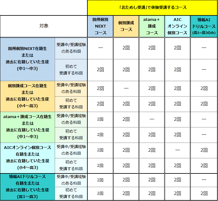 ①「鷗州合格必達個別ゼミ」に在籍中または過去に在籍されていた方※でも、「おためし受講」が適用となる場合があります。詳しくは、以下の表をご確認ください。