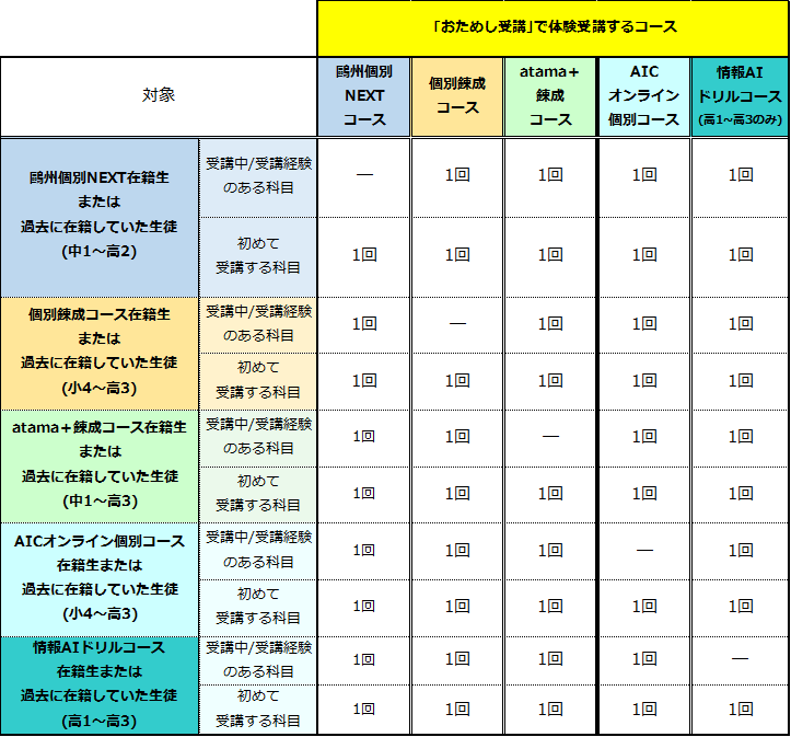 ①「鷗州合格必達個別ゼミ」に在籍中または過去に在籍されていた方※でも、「おためし受講」が適用となる場合があります。詳しくは、以下の表をご確認ください。