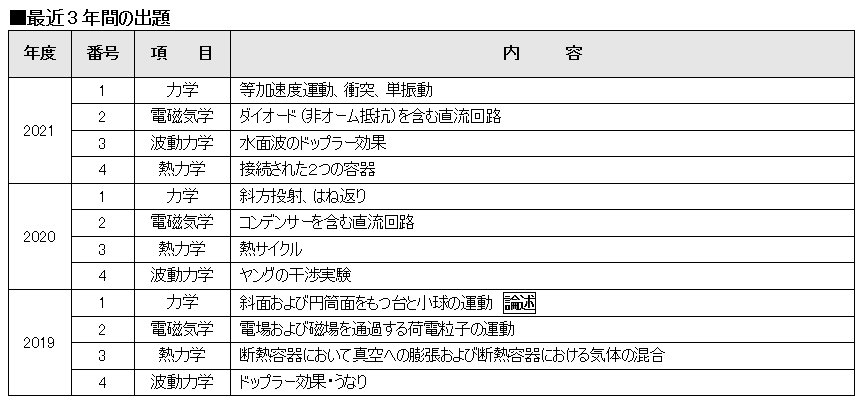 試験時間は60分。大問数はここ数年変化がなく4題で、2021年も力学、電磁気学、熱力学、波動の4つの分野から出題された。岡山大学の物理は2016年、2017年と難化していたが、2018年以降は基本的な問題中心の出題が続いており、2021年度も60分で大問4題を十分解ききることが可能なレベルであった。今後もこの出題傾向が継続すると予想されるが、突然の難化にも対応できるように準備しておくことが必要であろう。