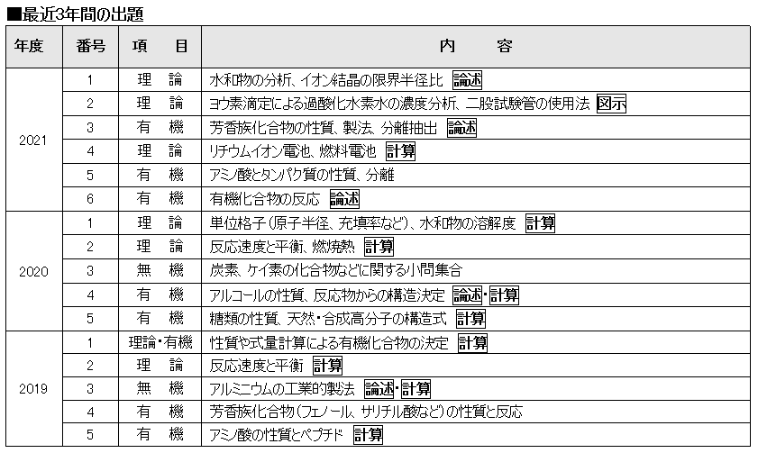 全体としては、「用語・知識」を問う空所補充問題、化学反応式、計算問題、化学的理解度を要する記号問題がバランスよく出題されており、かつ、融点の高さなど化学物質の性質の根拠を論述する問題が出題される。また、計算問題に関しては、導出過程を書かせるものも出題されている。