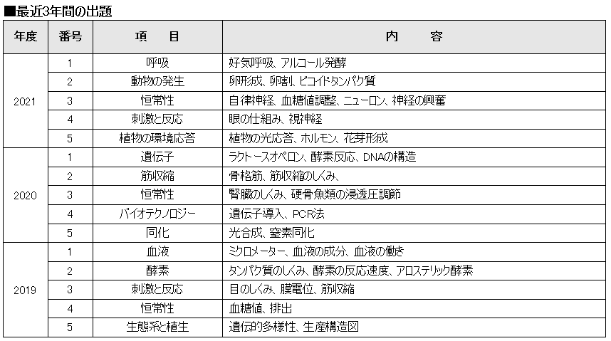 大問5は『植物の環境応答』に関する問題で、植物の光応答、ホルモン、花芽形成について出題された。光発芽種子や光屈性など基本問題が多かったが、最後の問5は日長と花芽形成に関する200字の論述問題で解答時間が不足した受験生は多かったと予想される。