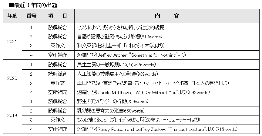 試験時間は100分と例年通りであり、読解総合問題2題と英作文1題、読解空所補充問題1題という構成であった。全体の分量は昨年度よりも約230語増加した。難易度は、下線部説明問題が1問増えたが、代わりに昨年まで出題されていた内容一致問題が今年は出題されなかった。難易度は全体としては昨年並み。
