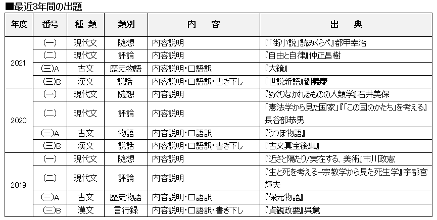 大問3(A)の古文の出典は『大鏡』、大学入試で頻出の作品である。本文分量や難易度は従来から大きく変化していないと言える。長年語句問題と和訳問題(一部説明問題)が主であり文章難易度も標準的であるため、オーソドックスなレベルの二次試験を幅広く解く中で語彙の増強と和訳ノウハウを確かに完成させることが重要であろう。国語全体の中でも高得点が計算的に見込める大問である。