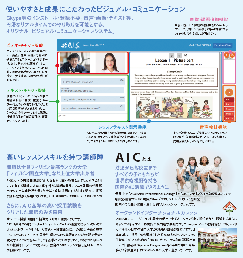 AIC推薦アカデミーの講座として、「TOEFL iBT® Over 80」「TOEFL iBT® Over 60(英検®準1級対策講座)」「英検®2級対策講座」「英検®準2級対策講座」を開講しています。英語4技能(読む・聞く・書く・話す)のうち、目標に合わせて自分に必要な技能を習得するためのコースを選択受講できます。詳しくはこちら!