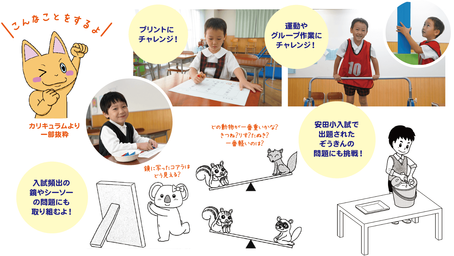 - 国・私立小学校の入試傾向に基づいた教材を使用し、入試に対応できる基礎力を養います。知識的授業(3回)・行動的授業(2回)の両方が含まれており、保護者の方は授業をご参観いただけます。毎回の授業で、家庭学習用教材を配付します。希望される方は、9月以降も継続して受講することが可能です。