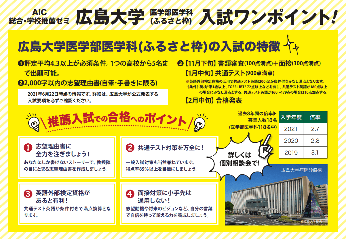 AIC推薦アカデミーでは、高校生・既卒生とその保護者の方を対象に、広島大学医学部医学科(ふるさと枠)入試の解説と個別相談会を実施します。