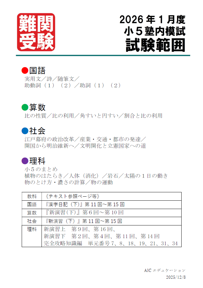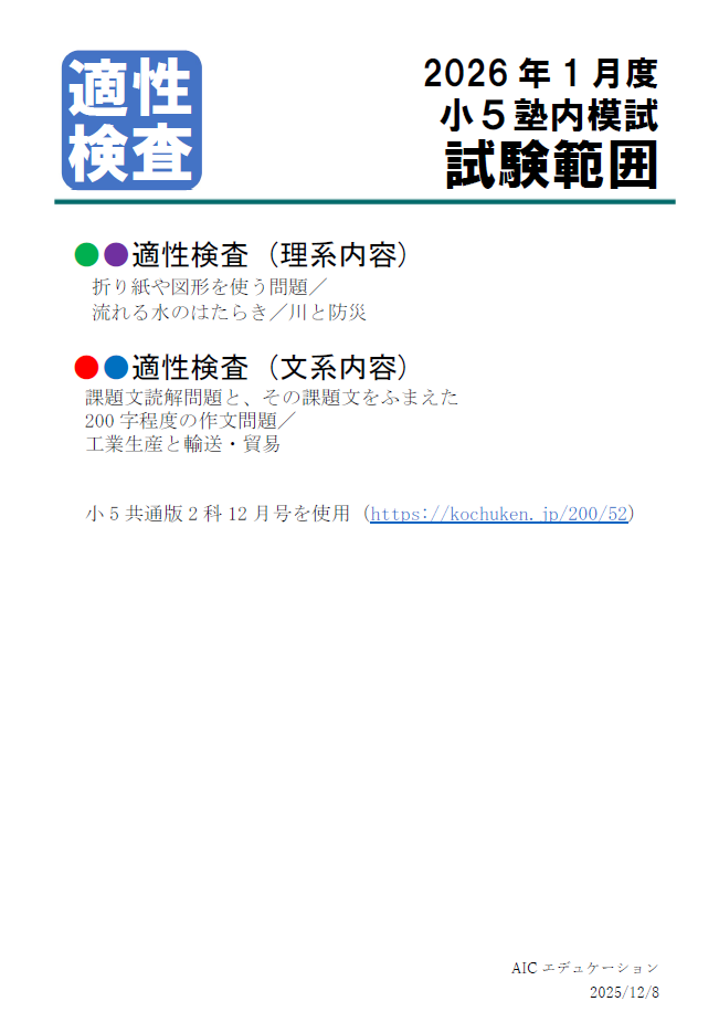 2026/1/9(金)17:00まで小5適性検査型の模試のみ、2026/1/4(日)までにお申し込みください。
