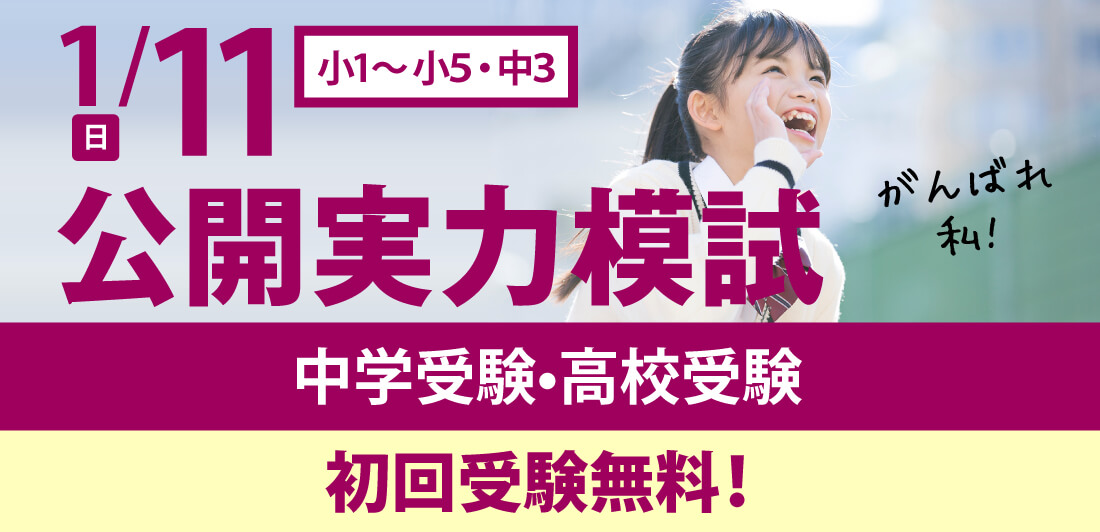 公開模試を今年度初めて受験される方は無料にて受験していただけます。模試結果をもとにお子さまの学習到達度・習熟度を把握するだけでなく、弱点を見つけ今後の学習法をアドバイスする『個別のカウンセリング』を行います。ぜひこの機会を弱点の克服や家庭学習にお役立てください。