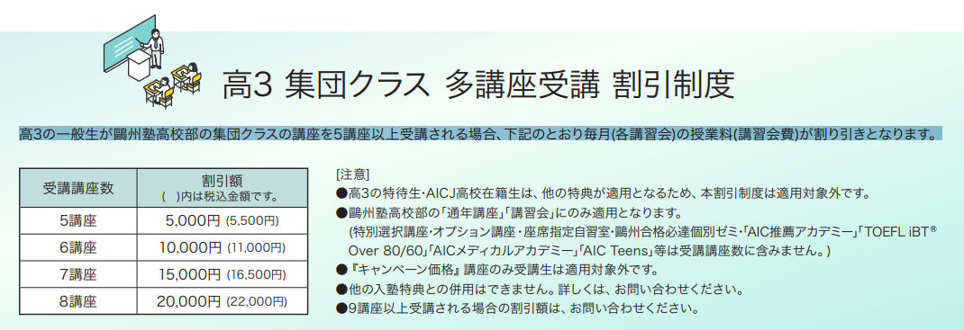 高3の一般生が鷗州塾高校部の集団クラスの講座を5講座以上受講される場合、下記のとおり毎月(各講習会)の授業料(講習会費)が割り引きとなります。