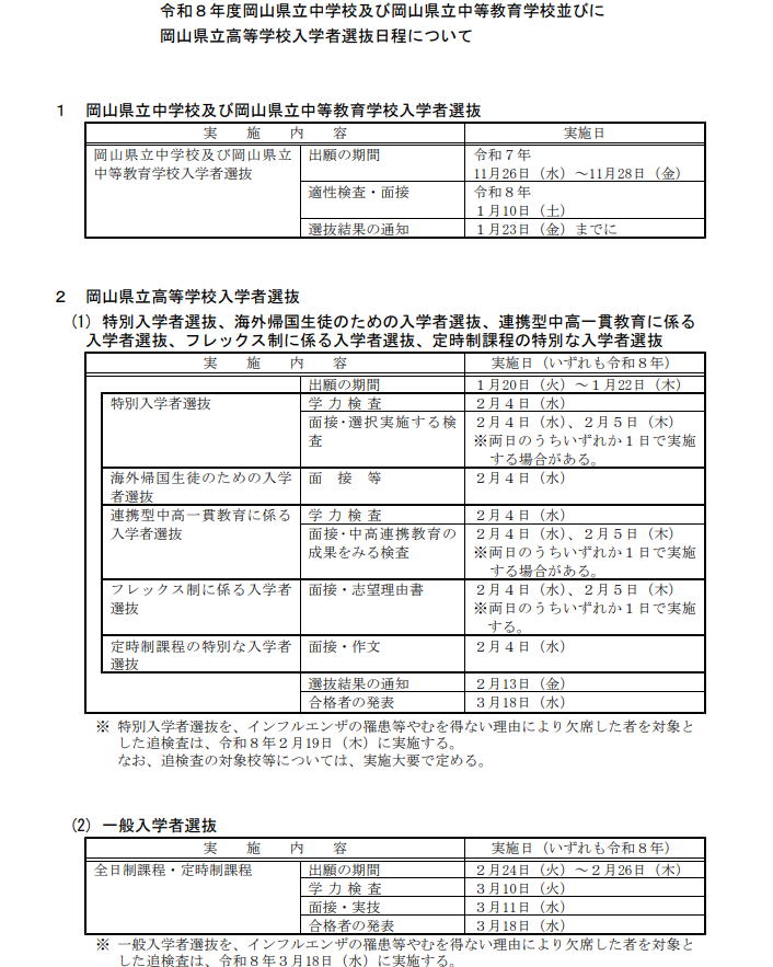 トップページ お知らせ一覧 岡山県立高等学校入学者選抜日程について 2025年08月08日 お知らせ 岡山県立高等学校入学者選抜日程について 令和8年度 岡山県立高等学校入学者選抜日程について 詳しくは岡山県教育委員会ホームページへ! 元のページへ戻る