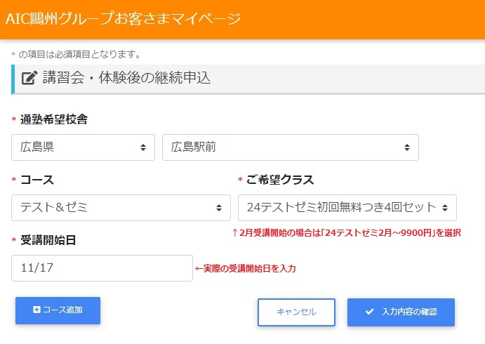 ⑧ 「通塾希望校舎」「コース」「ご希望クラス」「受講開始日」を選択し、「☑入力内容の確認」をクリック(タップ)します。