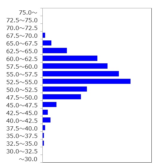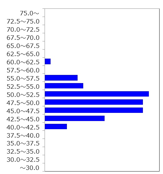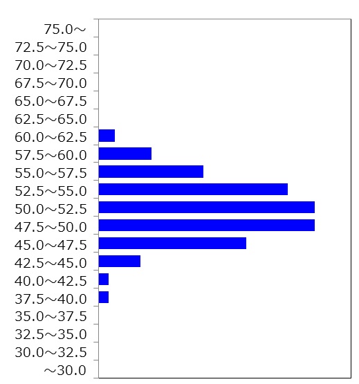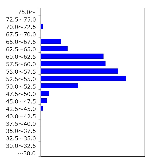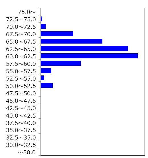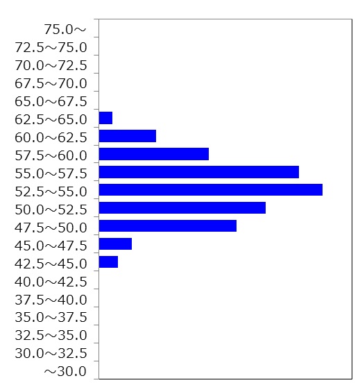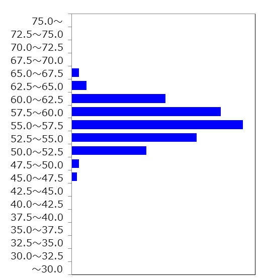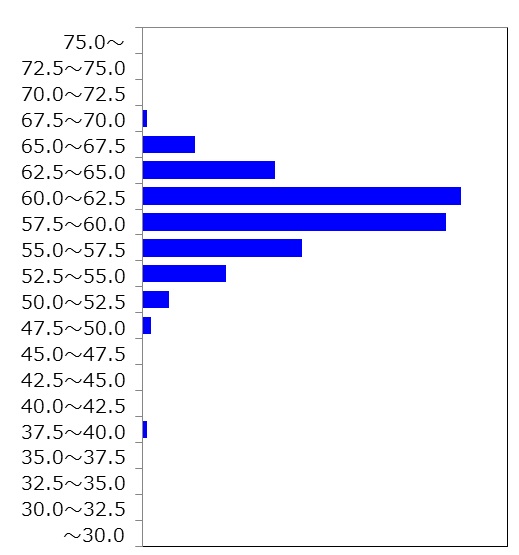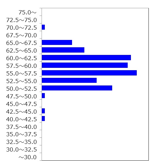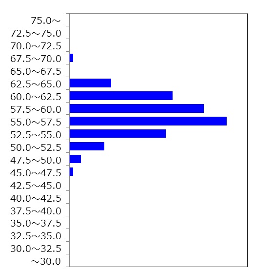 ②現状の入試ではいわゆる偏差値が受験校選定や進路指導においてある一定の意味があると考えられています。しかしながら、大切なのはお子さまに合った学習指導・校風の学校に進学することだと考えております。このグラフはあくまでも偏差値という括りでの各高校の合格者の状況であることをご理解ください。
