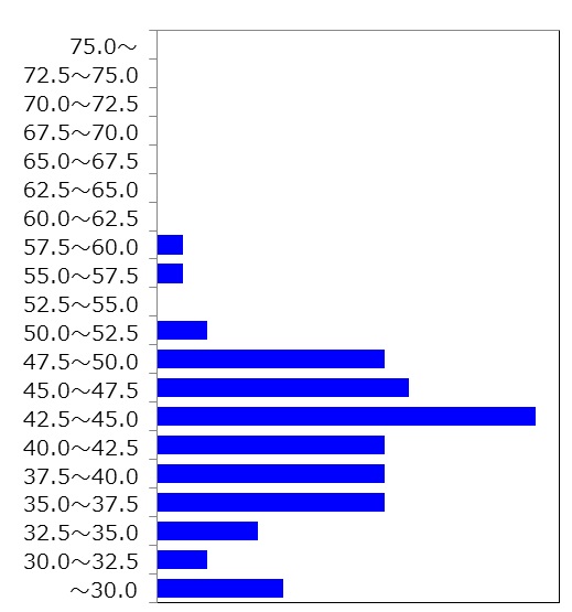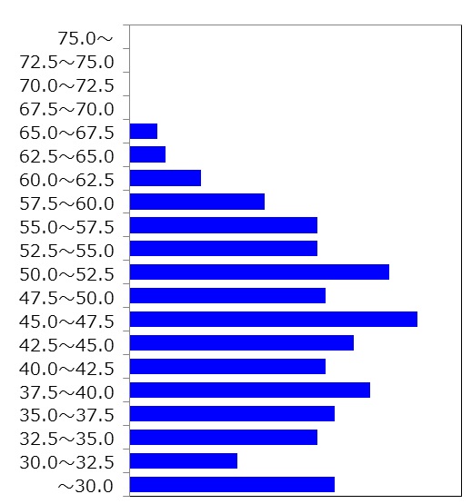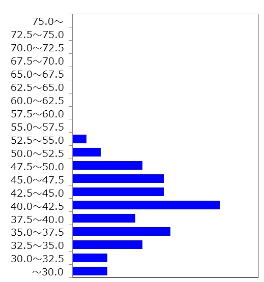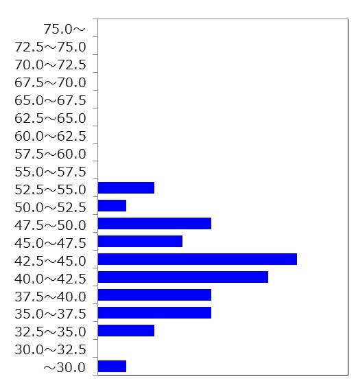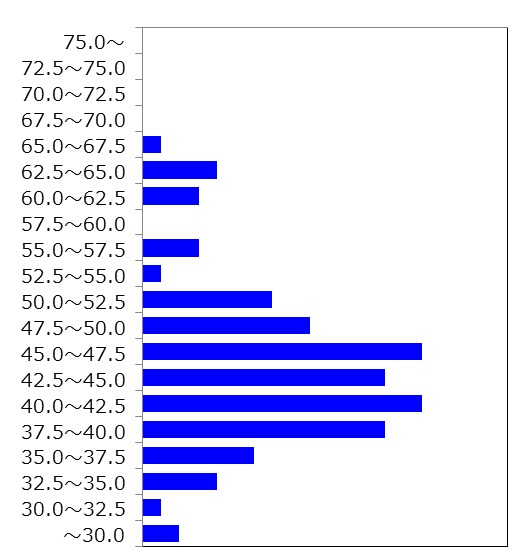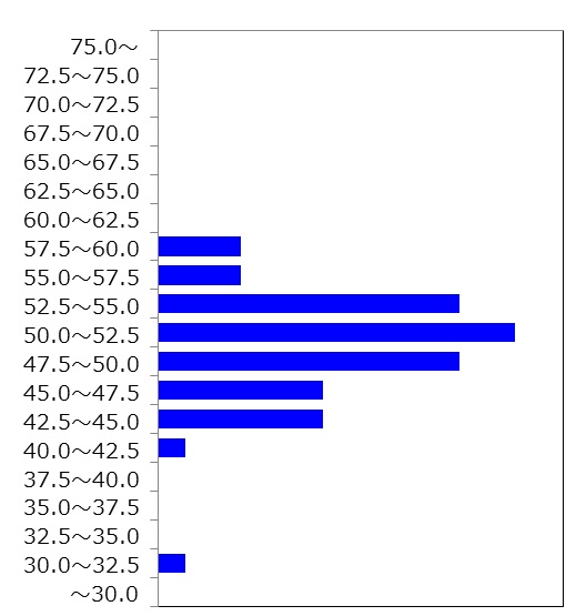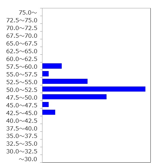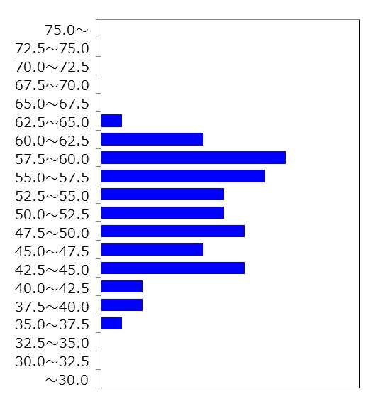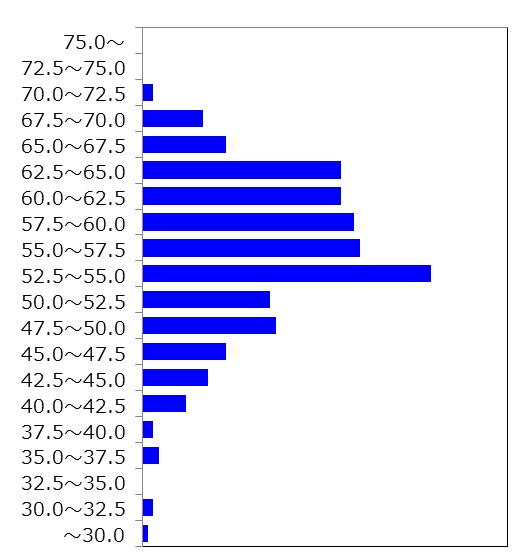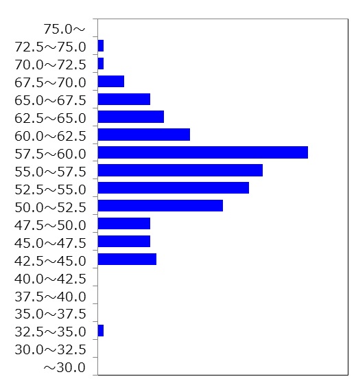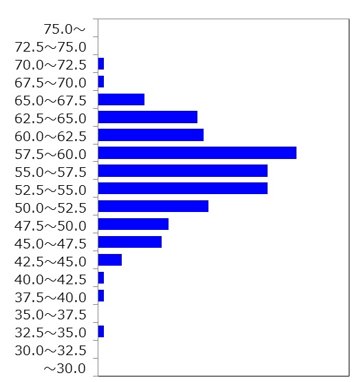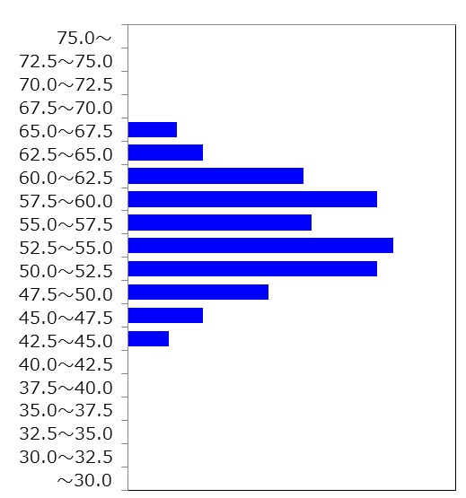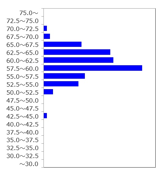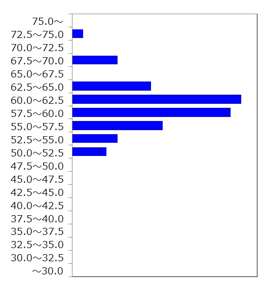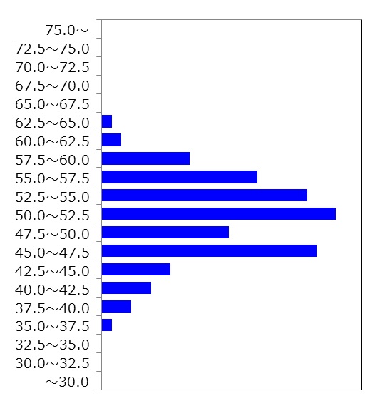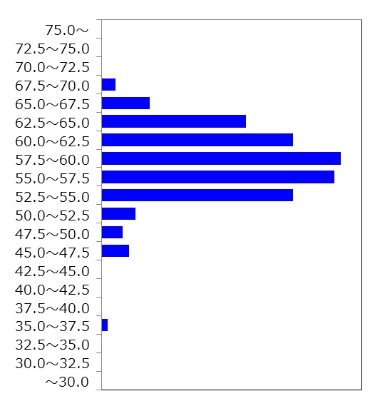 ②現状の入試ではいわゆる偏差値が受験校選定や進路指導においてある一定の意味があると考えられています。しかしながら、大切なのはお子さまに合った学習指導・校風の学校に進学することだと考えております。このグラフはあくまでも偏差値という括りでの各高校の合格者の状況であることをご理解ください。