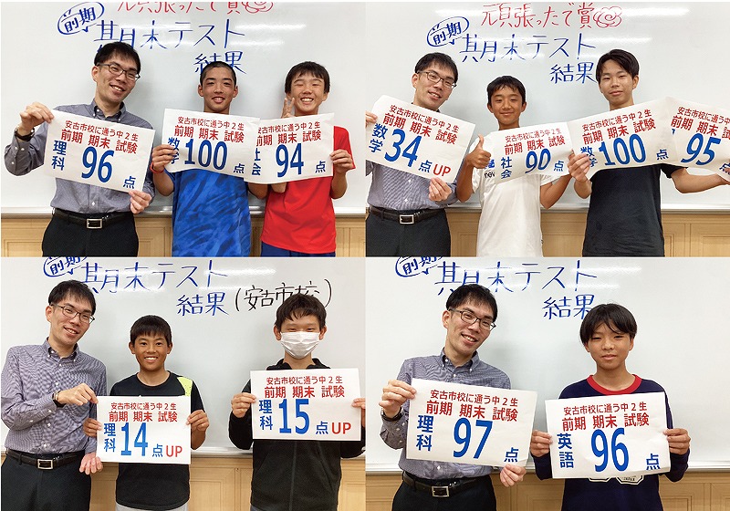 中2で通っている生徒さんの2024年度中学部前期期末試験の結果です(ごく一部の生徒さんを紹介)。多くの生徒が学校や塾のテストで良い結果を出せるよう日々元気いっぱい頑張っています!!