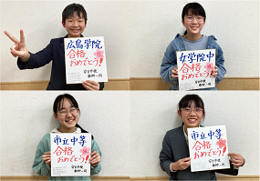 小学部選抜クラスの生徒さんは、広大附属中学・広島学院中学・AICJ中学・ND清心中学・修道中学・広島女学院中学・市立広島中等教育学校・県立広島中学などに進学されています。