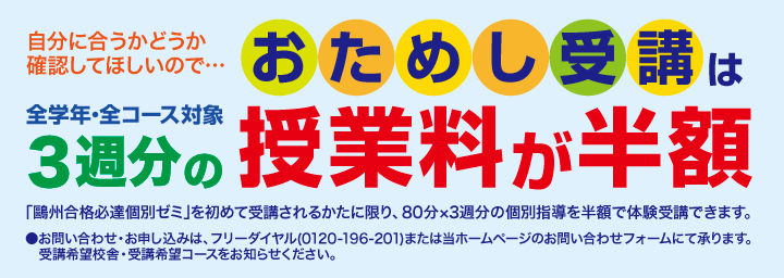 ! 鷗州合格必達個別ゼミの「おためし受講」は通年クラスに含まれません。また中高一貫校の中学生対象講座/コースを受講する生徒は、高校部の在籍となるため【適用条件①】には含まれません。