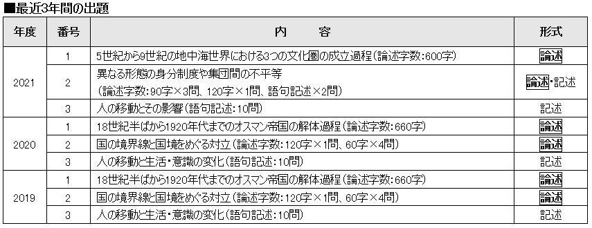 試験時間は、地歴2科目で150分。大問3題。第1問は大論述(600字)、第2問は論述(120字×1問、90字×3問)と語句記述2問、第3問は語句が10問。今年度の形式については、第1問は昨年度と変わらず600字、第2問は論述問題だけでなく語句記述も問われており、第3問は昨年度と同様に語句記述問題のみ。