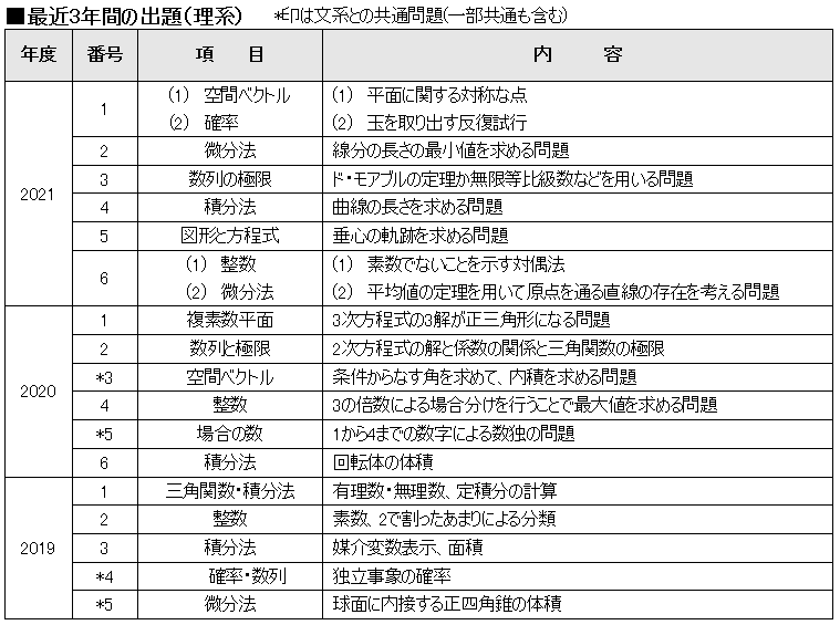 今年は基本的な問題が多かったが、全範囲からまんべんなく出題されているので、典型的・標準的な問題を確実に解く力をつけておきたい。また、京都大学の傾向である「誘導のない問題」でも自分で方針を立てれるように普段から練習しておきたい。整数・確率・微分積分など頻出の分野の対策は入念に行ってほしい。