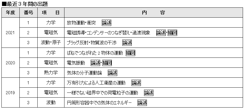 試験時間は理科2科目で180分、大問数は3題で例年通り。出題分野は例年力学と電磁気が1題ずつで、それ以外の分野から1題出題されているが、2021年度もこの通りであった。難易度としては2020年と比較するとやや易しくなっており、分量も少し減っているので、2019・2020年度と比較して合格者の得点率は高くなるであろう。