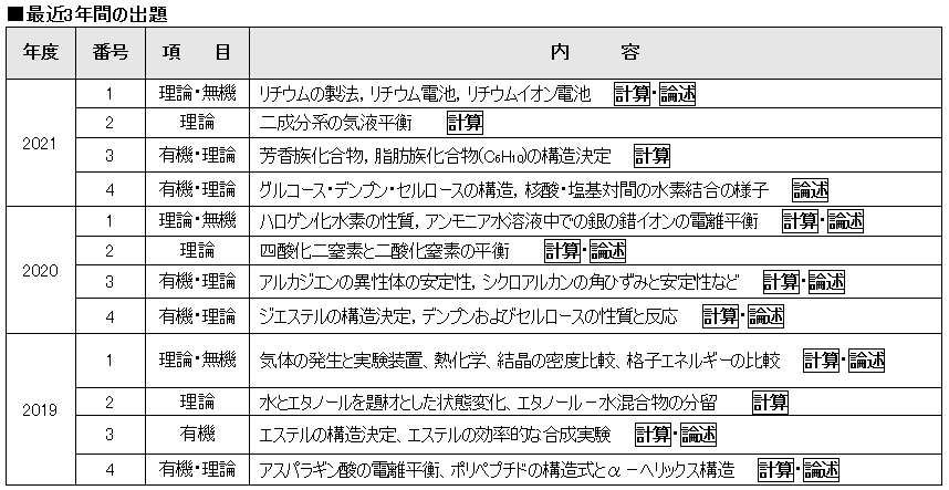 大問3は【Ⅰ】芳香族化合の構造決定、【Ⅱ】脂肪族化合物C6H10の構造決定であった。【Ⅰ】では分子式C8H8O2,【Ⅱ】では分子式C6H10が題材となっており、いずれも炭素数が多くないことから短時間で確実に解答したい問題であった。