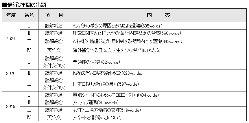 試験時間は80分と例年通りであったが、昨年度の読解総合問題3題(ⅠとⅢに英作文を含む)から一昨年までの読解問題+英作文1題という従来の形に戻った。昨年度と比べると、全体の分量は昨年度の約1880wordsから今年度は約1690wordsへとかなり減少した。例年の平均が約1600wordsであることを考えると、例年に戻ったと言える。難易度としては、全体の分量がかなり減った分、易化したと言えるであろう。