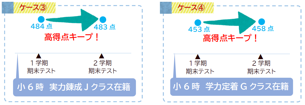 では、ここで現中学1年生(皆さんの先輩)の例を紹介します。点数は5科目(英・数・国・理・社)で500点満点です。